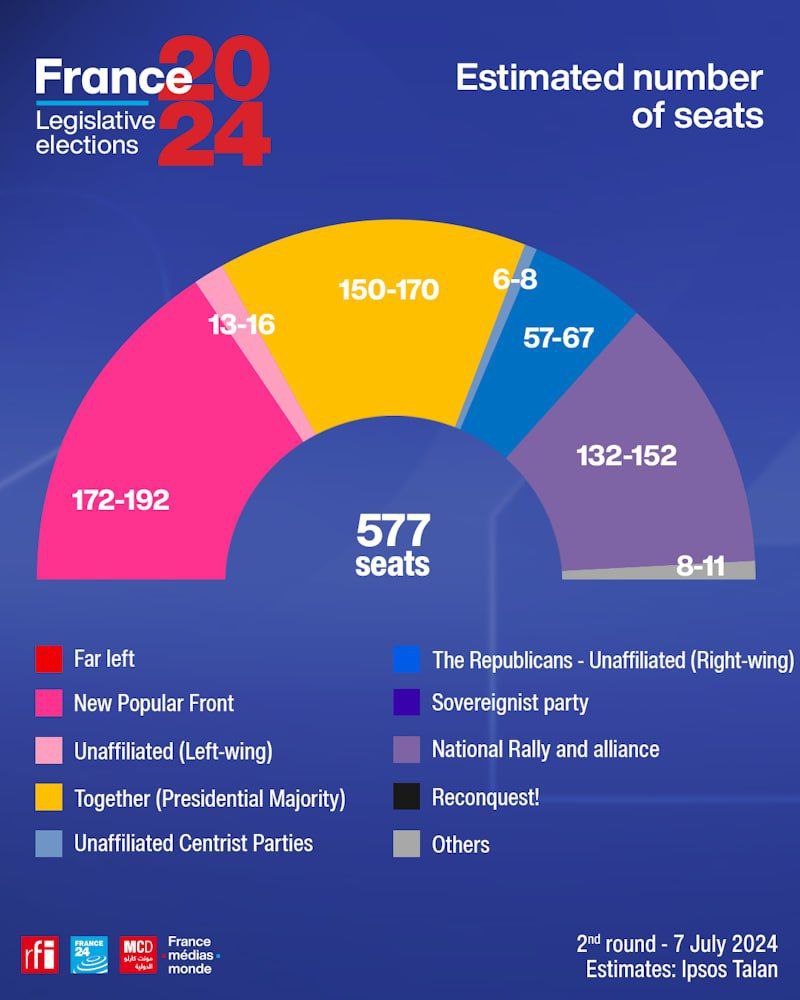 The right-wing Rassemblement Nationale came third in the second round of French parliamentary elections, behind the left-wing New Popular Front bloc and a pro-Macron coalition.