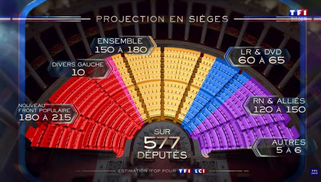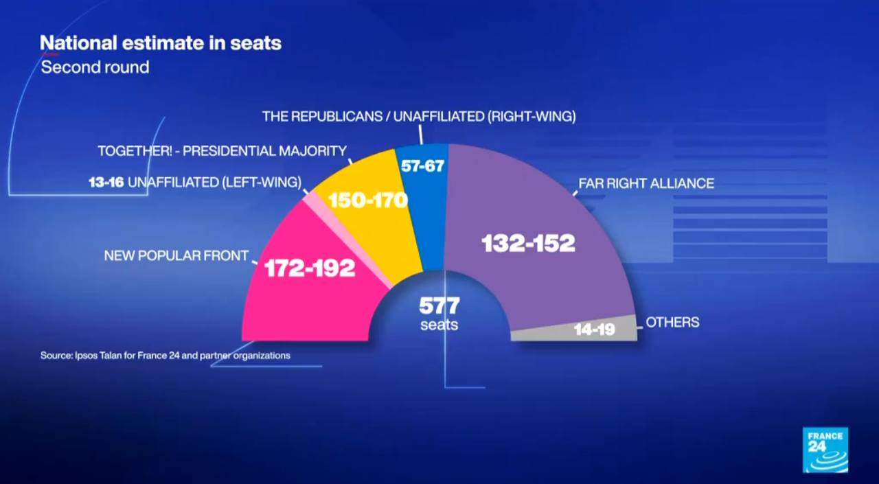 Правое "Национальное объединение" заняло третье место по результатам второго тура парламентских выборов во Франции, уступив левому блоку "Нового народного фронта" и промакроновской коалиции.