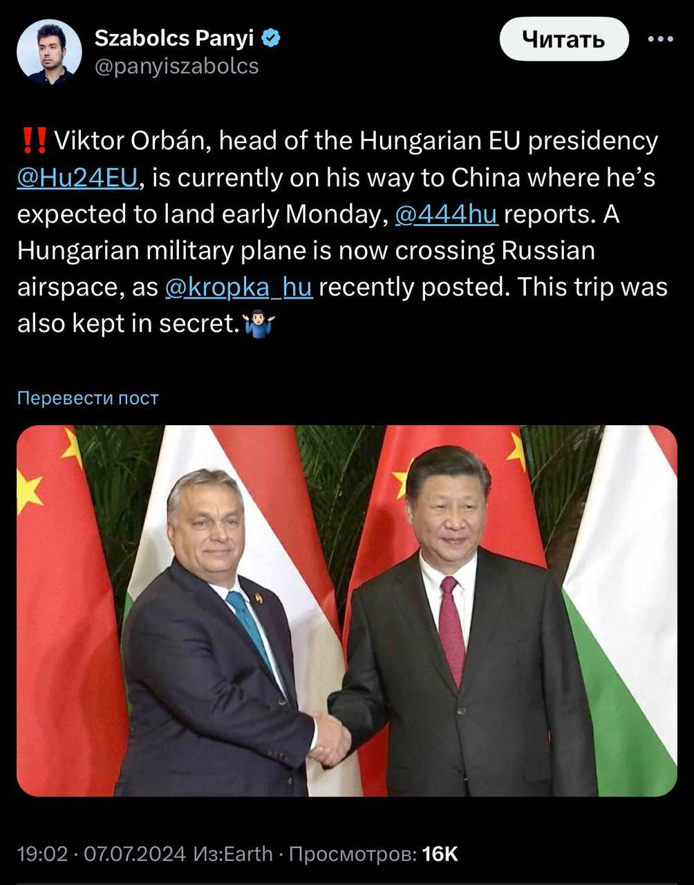 Орбан уже в Китае, там он проведет переговоры с Си Цзиньпином, сообщил пресс-секретарь венгерского премьера