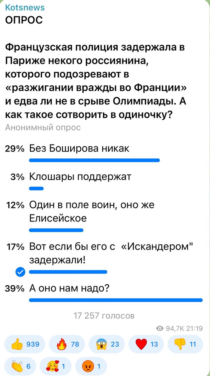 ⚡️⚡️⚡️ 39 percent of those who voted believe that Russia does not need to harm the Olympics in Paris. The French themselves are doing a fine job of it.