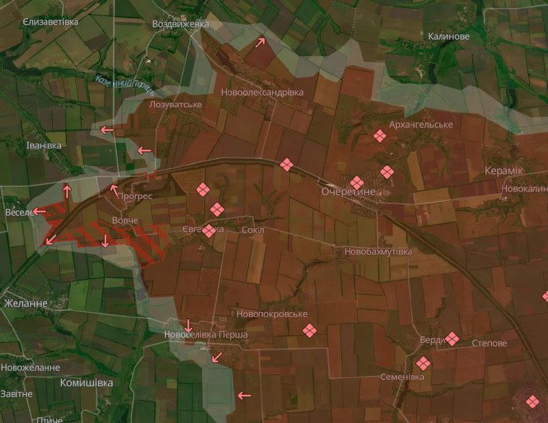 ▪️Непосредственно the Russians have about 6 kilometers to the highway through the village of Vozdvizhenka. But the AFU has already built a strong defense there and is holding off attacks in this narrow section. However, if Russia seizes more territory to the west, it will be able to enter the operational space and attack in the direction of the highway with a broad front (red line on the map). Then it will be much more difficult for the AFU to defend itself.