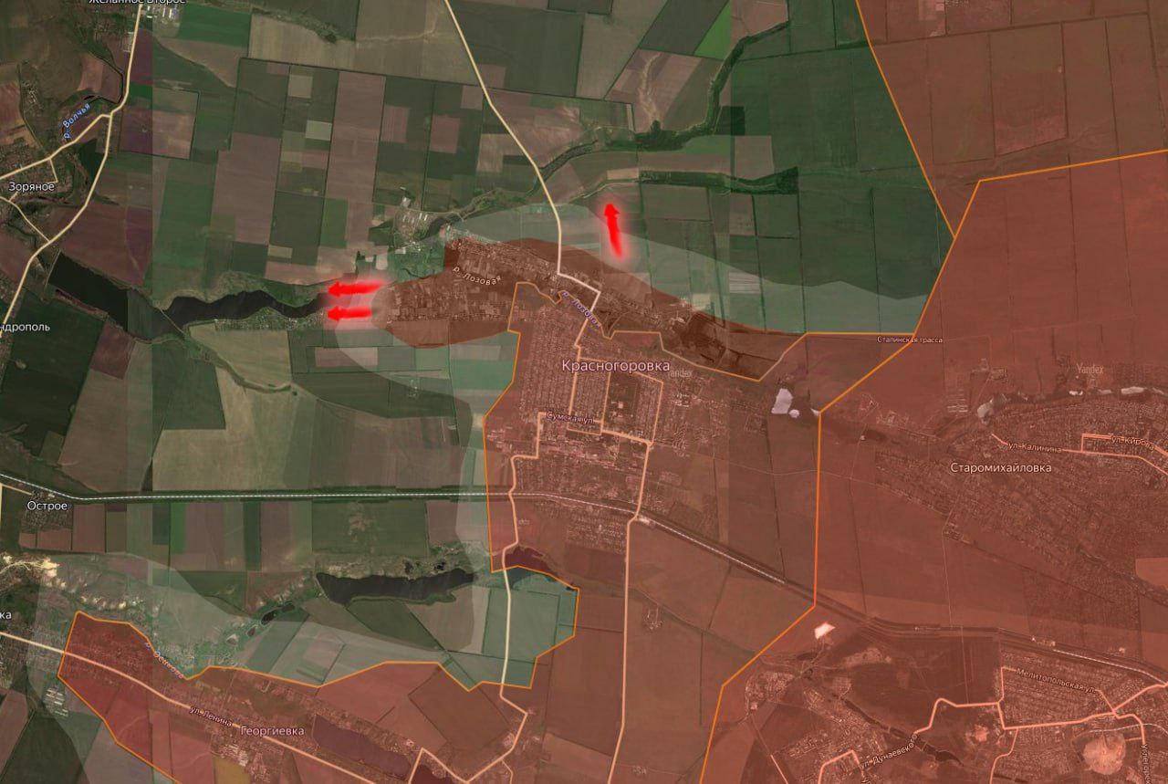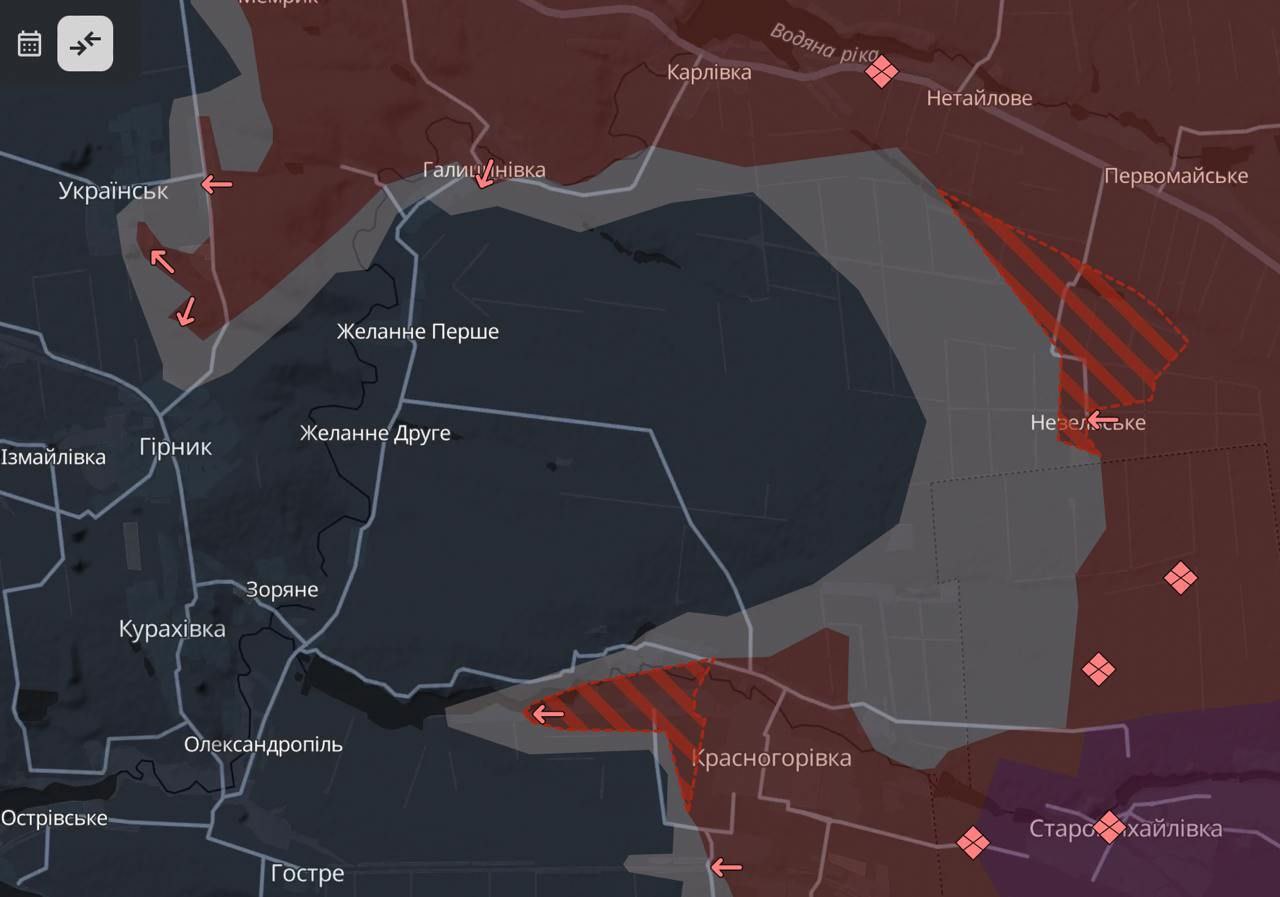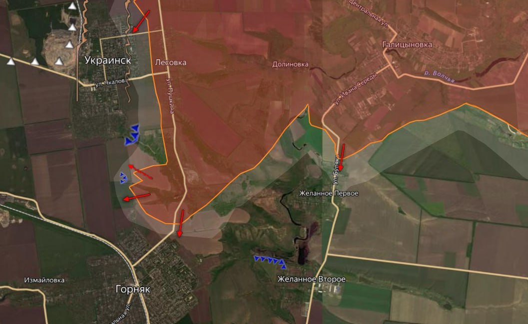 ▪️"Армия России смогла продвинуться в южную часть города Украинск, заняв часть дач, гаражный кооператив и ведя штурм многоэтажных домов по улице Горького. Также ВС РФ стремятся продвинуться к шурфу шахты «Украина».