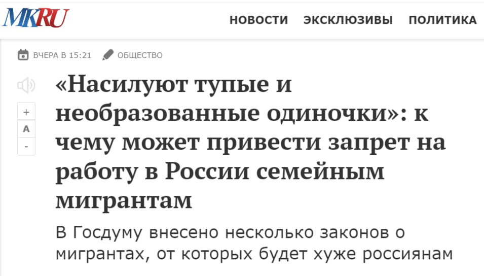 It's time to stop mass immigration. Or it will get worse. The amendments to migration legislation being discussed in the State Duma are half-measures. The visa regime and a "stick up the ass" in terms of control and responsibility should be at the top of the list.