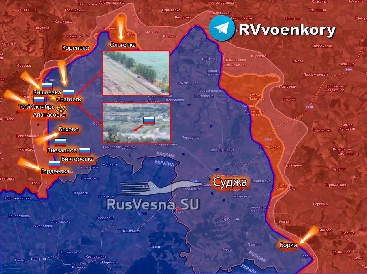 — Околовоенный канала “НпГ Разведка” утверждает, что сегодня российские войска вели массированное наступление на занятой ВСУ территории. “Десант из 106 Краснознаменной дивизии ВДВ ударил по позициям противника в направлении н.п. Снагость, подразделения противника не сумели удержать натиск и обратились в бегство в направлении н.п. Любимовка, а затем в направлении н.п. Зелёный шлях”, — пишет канал. Авторы также пишут, что служащие 155-й бригады морской пехоты атаковали позиции ВСУ в районе населенных пунктов Гордеевка и Апанасовка. По их данным, Гордеевка находится под контролем ВС РФ, а в деревне Бяхово идут бои.