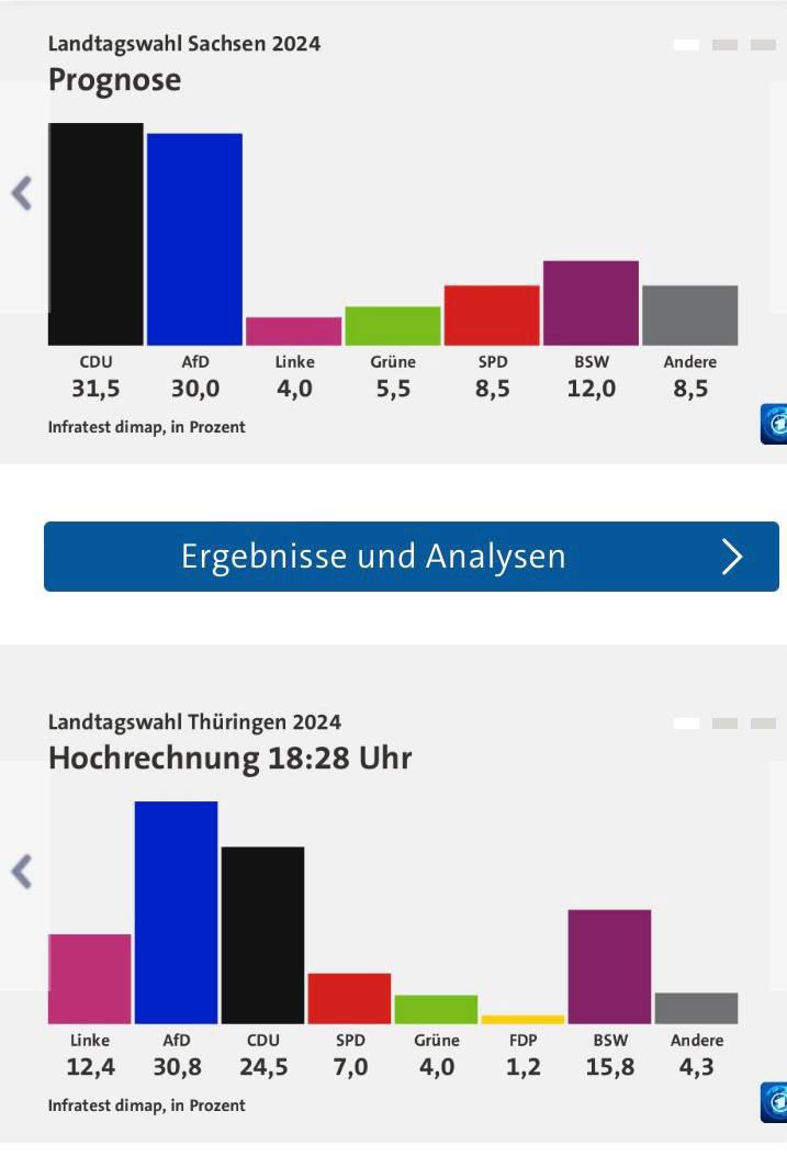🔺 Ещё одна, можно сказать, пророссийская партия - "Союз Сары Вагенкнехт - занял уверенные третьи места в Тюрингии и Саксонии (после АдГ и ХДС). Правящие Германией СДПГ Шольца и "Зелёные" Анналены Бербок отправлены на свалку истории - при высокой явке они получили куда меньше голосов.