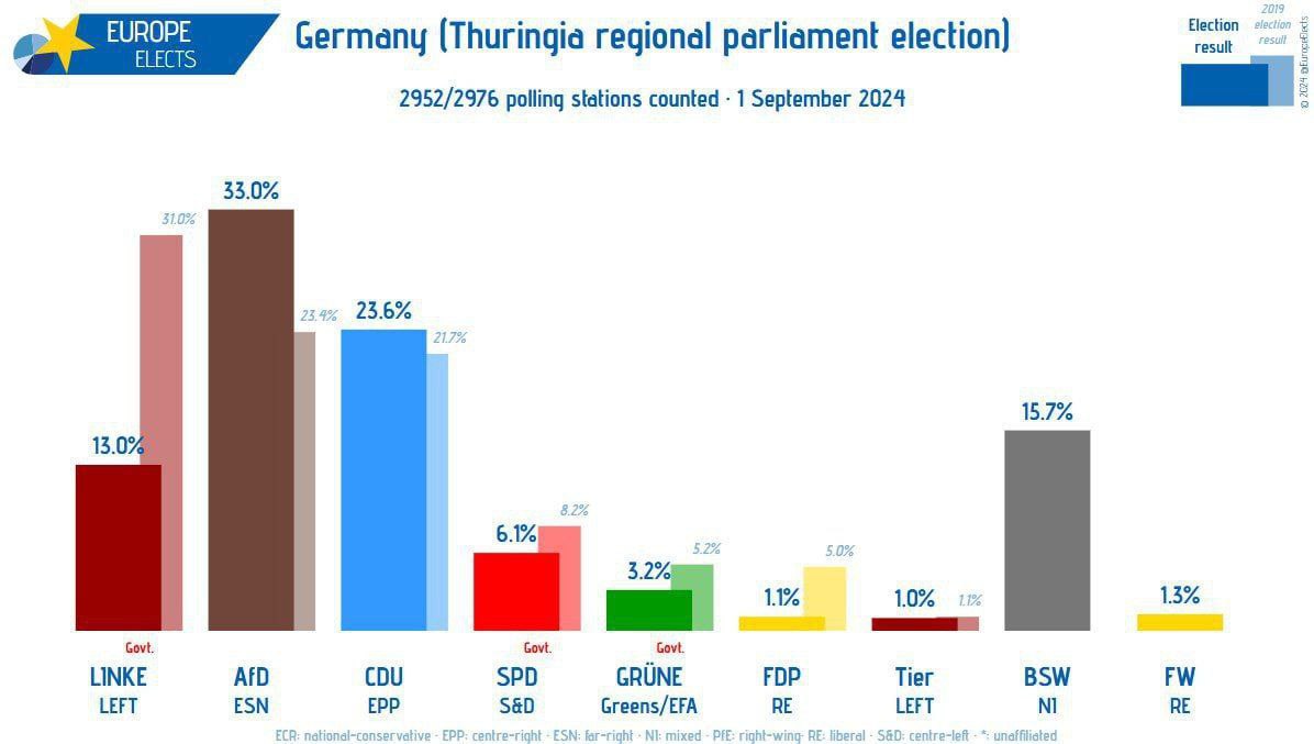 🔥 Meanwhile, in Germany, for the first time in post-war history, a party labeled as "extreme right-wing" and "pro-Russian" took first place in regional elections.