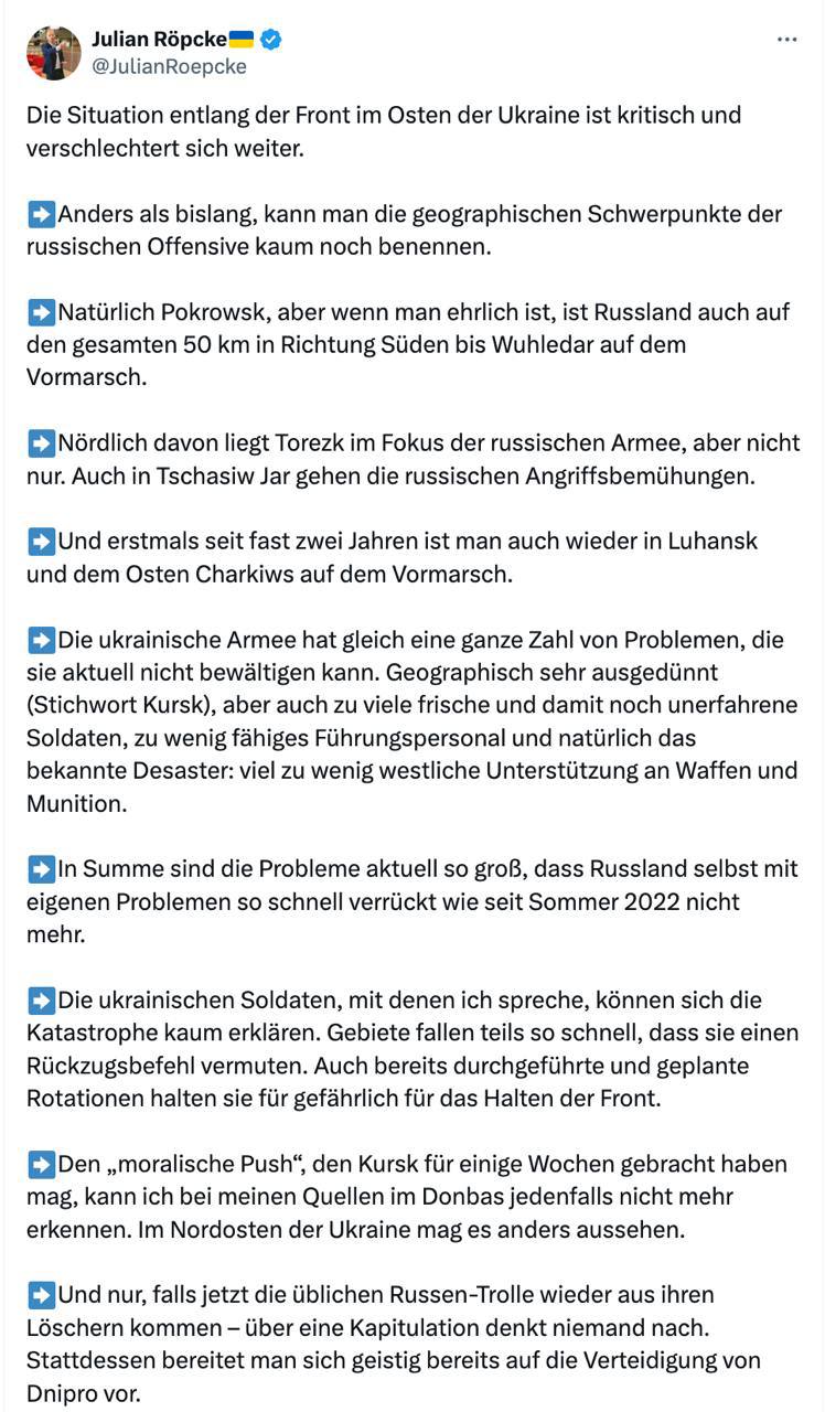 According to his assessment, the situation on the eastern front is "critical and continues to deteriorate", with the Russian Federation managing to advance faster than it did in the summer of 2022.